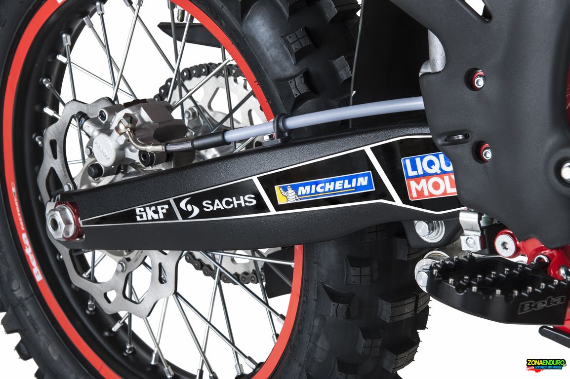 The RR Racing versions include a high-end suspension package that includes a new Sachs fork with a closed cartridge. This fork is the result of a long collaboration between Beta and Sachs, German know-how and Italian experience in the off-road sector. Several tests, including on-track data acquisition, computer simulations and laboratory tests, have allowed this top performance fork to be developed.